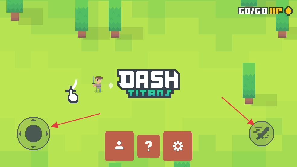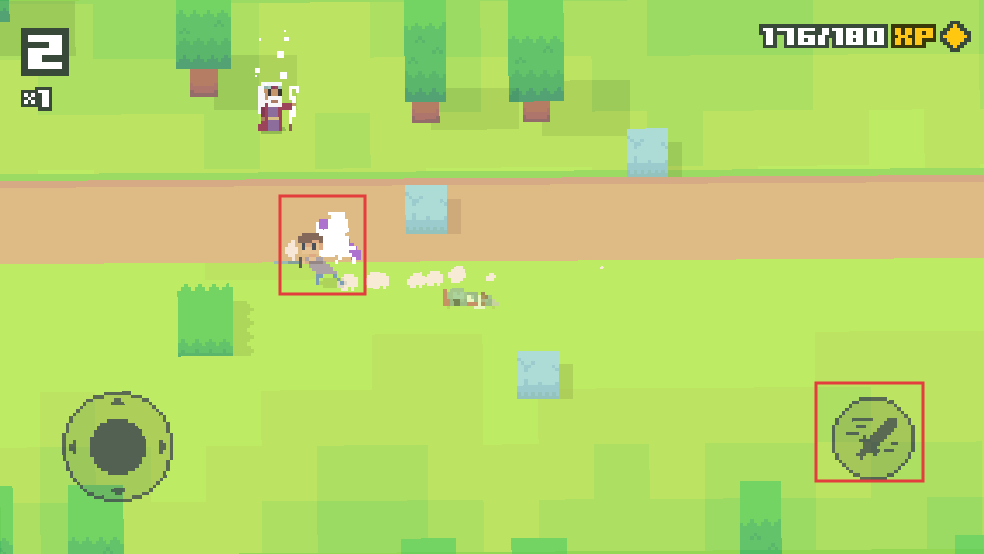 2、进入游戏后,操控左侧圆形方向键移动角色,右侧武器按钮可发动攻击,在绿色场景中开始探索战斗。