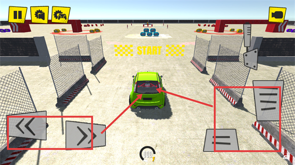 2、进入关卡后,利用左侧左右箭头按钮控制赛车方向,配合右侧操作键,操控绿色赛车准备出发。