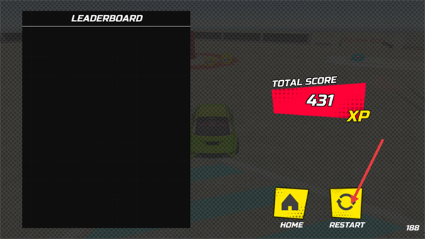 4、关卡结束后,查看总分,若想再挑战,点击黄色【RESTART】按钮,重新开始该赛道的赛车挑战。