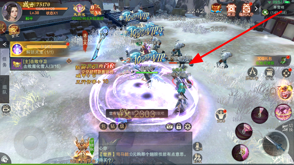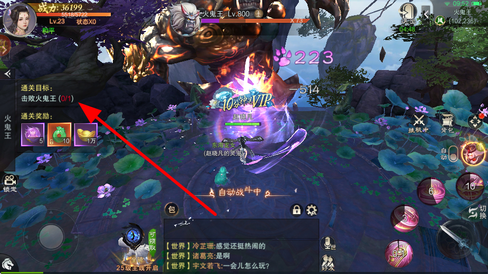 2、战斗场景中,面对敌人,操控角色施展技能,全力攻击火鬼王,努力达成通关目标,击败敌人完成冒险任务。