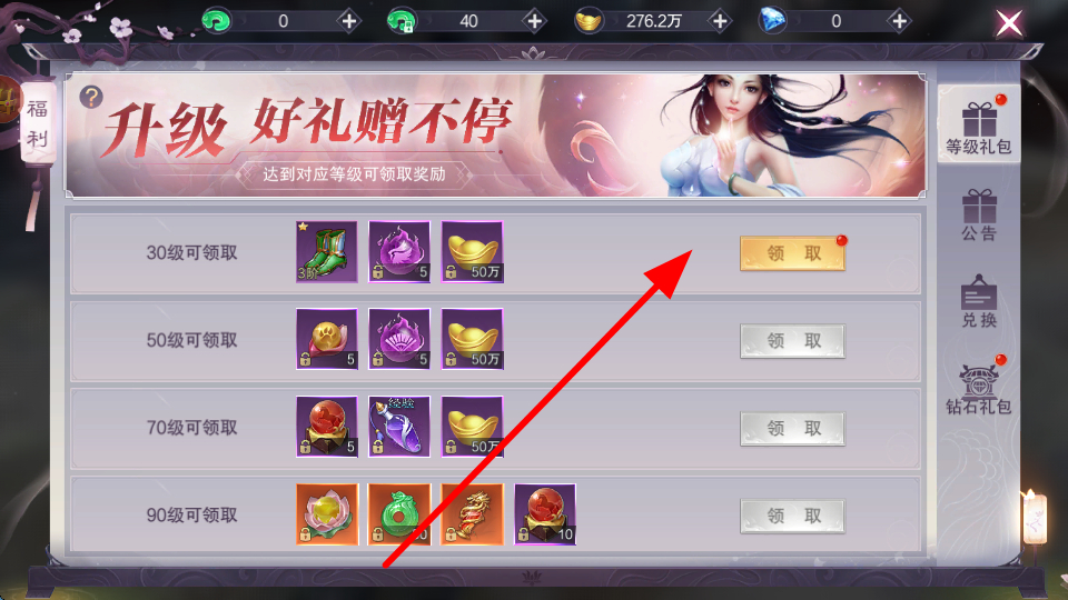 4、当角色达到对应等级时,进入奖励界面,领取升级好礼,这些奖励可用于强化角色,助力后续更具挑战的冒险与战斗。