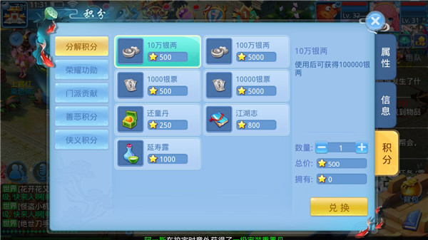 3、积分兑换----不管是分解道具材料、行侠仗义、竞技场、群雄逐鹿、门派任务等活动,都可以获得积分奖励,在人物积分兑换界面可以兑换银两,日积夜累积分是很多的。