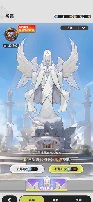 3、心愿女神像:抽人物技能,开局官方是给了30抽传说,后续保底就是70抽,建议大家前期打打任务把第一个传说技能抽到。星之愿有10连就直接抽,不要赞,不然战力和进度跟不上的。