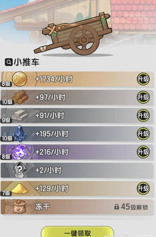 4、小推车系统:其实就是离线资源收益,前期资源不是很缺,所以可以先把资源等级平均拉起来,第三天左右吧就开始提升木材和石块,不然其他的资源升级材料不够的。