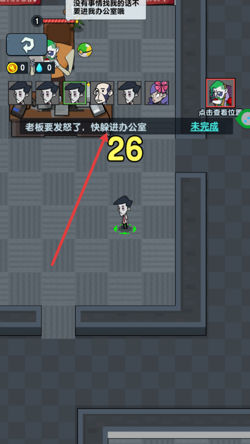 2、当显示【老板要发怒了,快躲进办公室】且倒计时【26】时,操控角色快速移动至安全区域。