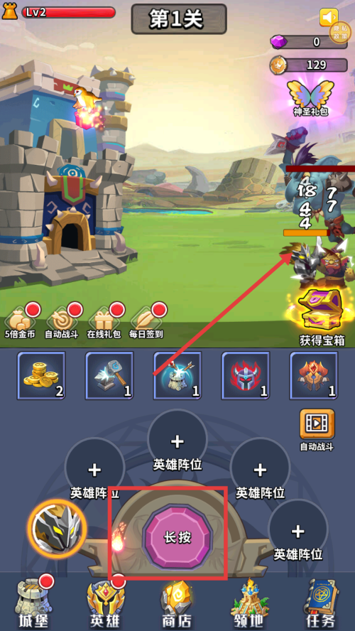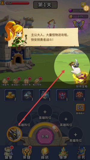 1、怪物进攻时,根据提示安排勇者战斗,可点击界面相关区域,让勇者出击抵御怪物,守护城堡。