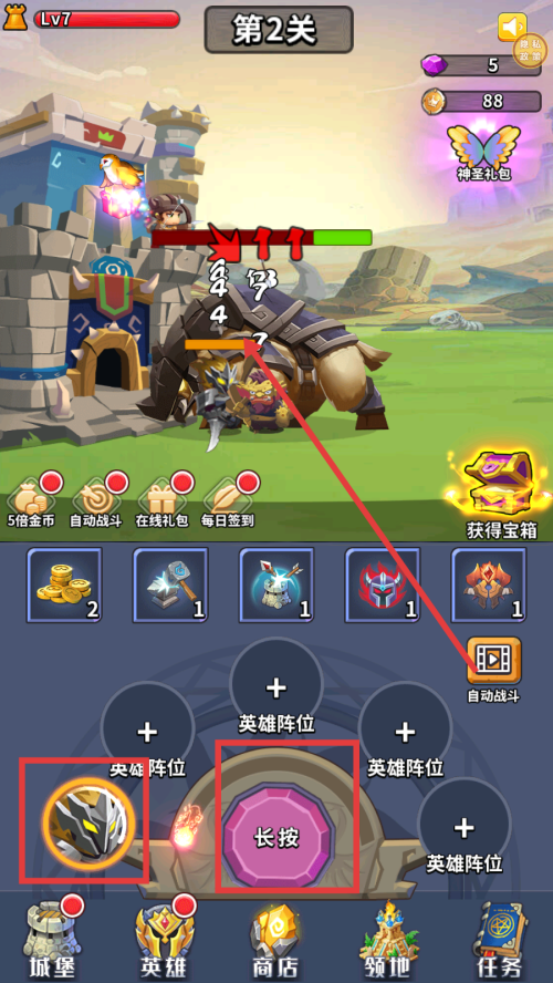 2、战斗中,长按【长按】按钮,能持续发动攻击,同时可利用下方道具,辅助提升战斗效果。