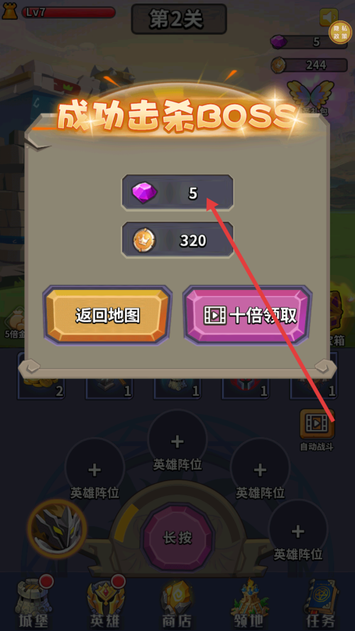 4、成功击杀BOSS后,会获得【5】颗紫宝石和【320】金币奖励,可选择【返回地图】或【十倍领取】奖励。