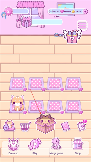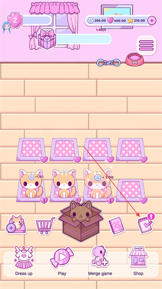 2、点击盒子里的小猫,将其放置到粉色垫子上,增加宠物数量。