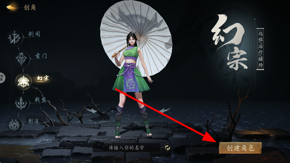 1、创建职业角色,可以选择如幻宗等职业,输入名字后点击创建角色,即可进入游戏世界。