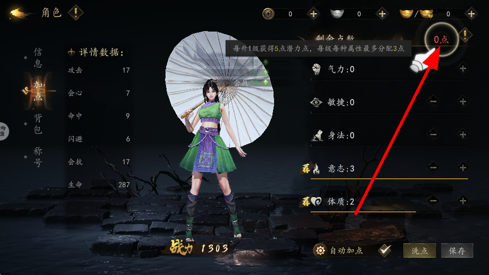 3、升级加点属性时,每升1级可获得5点潜力点,根据职业特点和战斗需求,分配气力、敏捷等属性点。