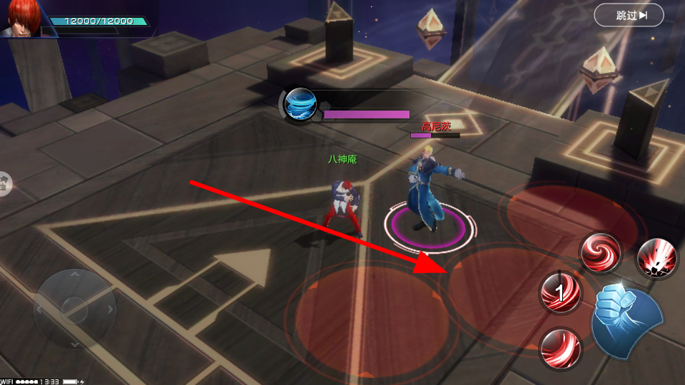 1、玩家移动靠左侧摇杆,能控制八神庵在战斗场景中前进、后退、向左或向右移动。
