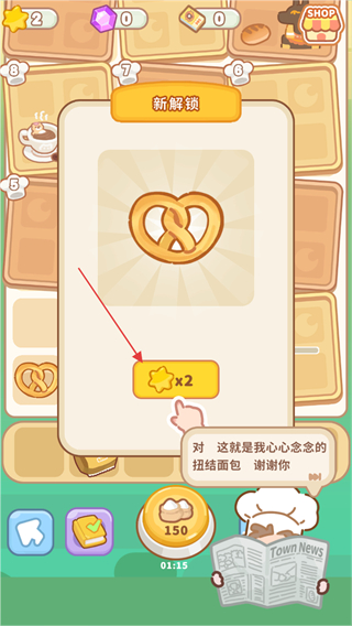 4、当达到解锁条件,出现新解锁提示如解锁扭结面包,点击确认领取奖励,解锁新的面包种类,继续探索游戏内容。