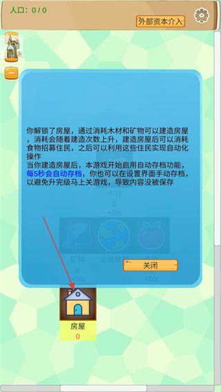 1、看到解锁房屋提示后,了解到可消耗木材和矿物建造房屋,点击关闭按钮关闭提示框。