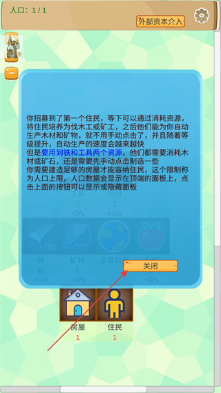 4、招募到第一个居民后,阅读培养居民成为伐木工或矿工等相关说明,点击关闭按钮,后续通过消耗资源培养居民实现自动化生产。