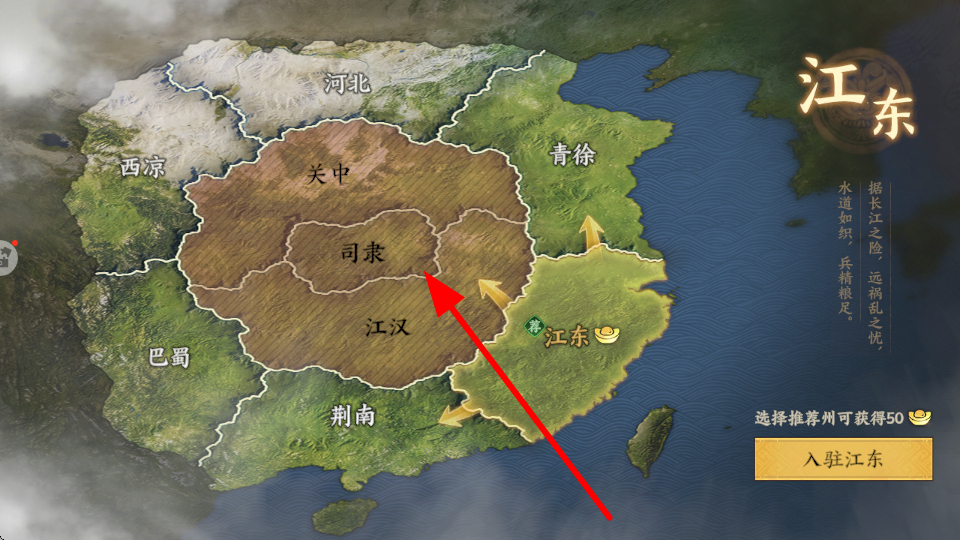 4、选择区域入驻,在地图上挑选合适的区域,点击入驻,让己方势力入驻该区域,拓展自身的地盘与影响力。