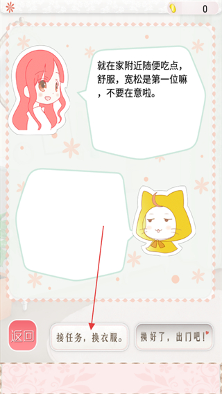 1、阅读对话文本,了解在家附近就餐及穿着要舒适宽松的建议后,点击接任务,换衣服按钮。