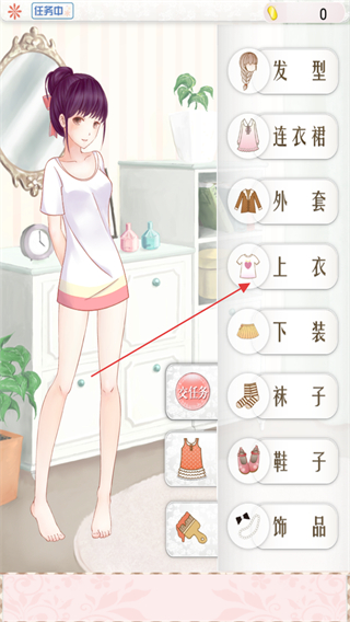 3、点击右侧服装分类栏中的上衣,挑选喜欢的上衣为角色搭配。