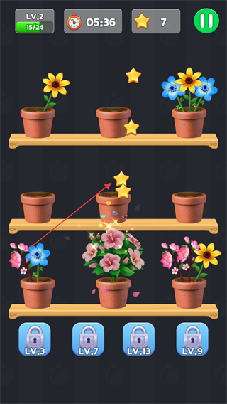 1、留意屏幕上方等级LV.2、倒计时05:50和星星数量,找到三朵相同花朵进行合成获取星星。