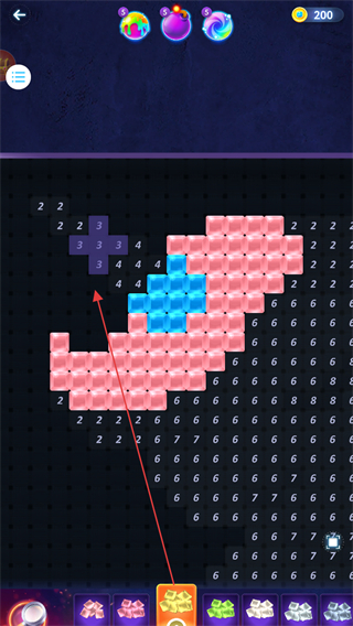 2、点击下方不同颜色的宝石,如紫色、橙色等,放置到方阵中,使同色宝石相连,当相连同色宝石数量达到或超过旁边标注数字时,即可消除这些宝石。