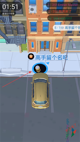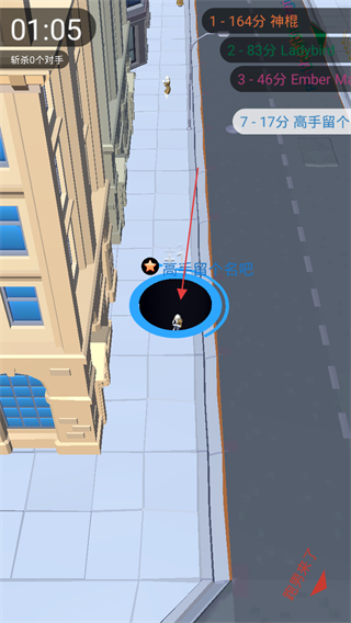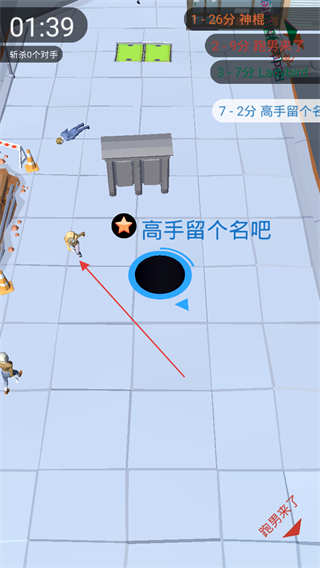 2、屏幕左侧显示斩杀0个对手,去街道、广场等区域,吞噬行人、小型障碍物,增大黑洞体积。