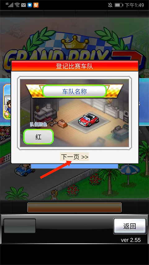 2、接着选择好车队名称和队伍颜色,选择【下一页】选项,设定好登记车队主信息,选择【开始游戏】选项,