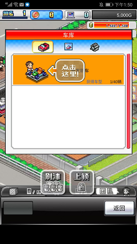 4、首先选择下方【车库】选项,开始开发一台参加比赛的赛车,