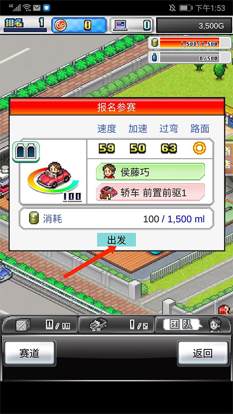 11、可看到比赛的等级、奖金、成绩、道路、温度、奖品等信息,选择【参加】选项,确认好我们的赛车手、赛车等信息后选择【出发】选项,