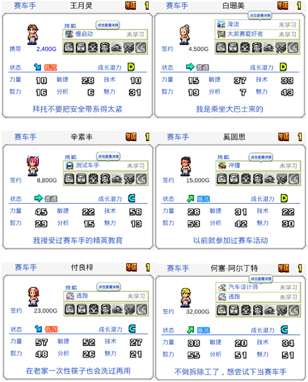 先说赛车手,赛车手的属性主要有油门、换挡、转向、魅力、技术和分析组成。