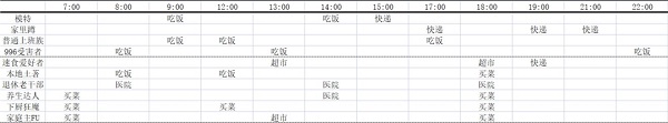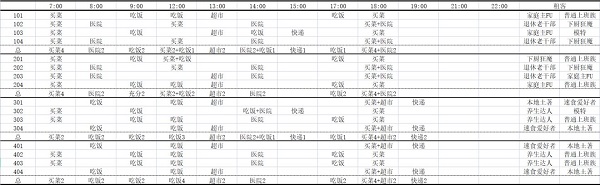 家庭主妇:7点买菜,9点活动,13点超市,18点买菜,20点活动