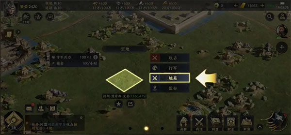 3、玩家在迁城范围内,点击任意非他人占领的土地,即可建造地基,点击按钮开始修建,地基修建好后,点击地基,弹出迁城按钮,二次确认后即可迁城。