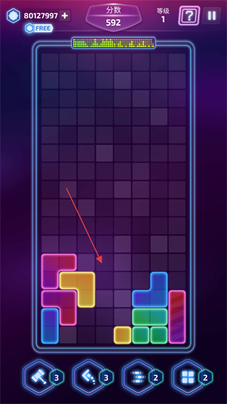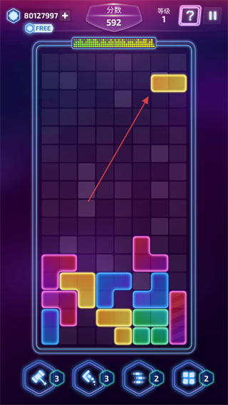 2、新的方块出现后,规划其摆放位置,尽量让方块组成完整的横排或竖排。