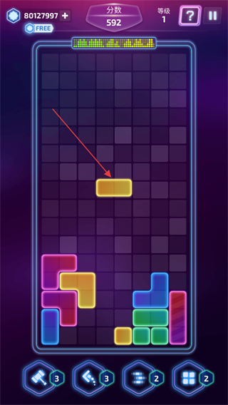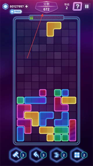 1、进入游戏,查看屏幕上方的分数,等级,观察掉落的彩色方块,选择合适位置放置。