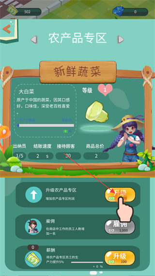 2、进入农产品专区,点击升级农产品专区按钮,提升专区利润,还能点击雇佣按钮招聘员工。