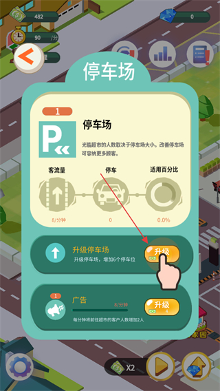 4、点击停车场建筑,进入界面后点击升级停车场按钮,增加停车位,提升客流量,促进店铺经营。