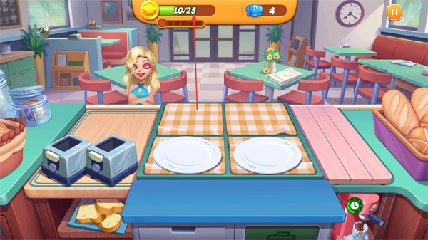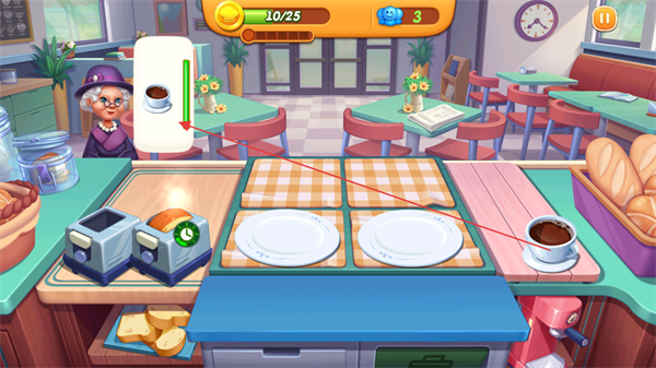 1、进入游戏,查看屏幕上方金币目标10/25和顾客情绪值如4,留意顾客需求。