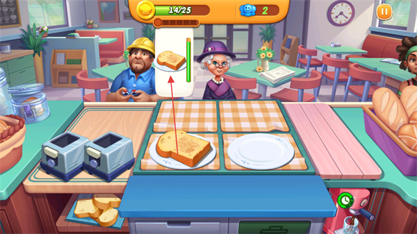4、将做好的餐点交付给顾客,获取金币,提升金币数量,避免顾客情绪值降低,完成金币目标通关。