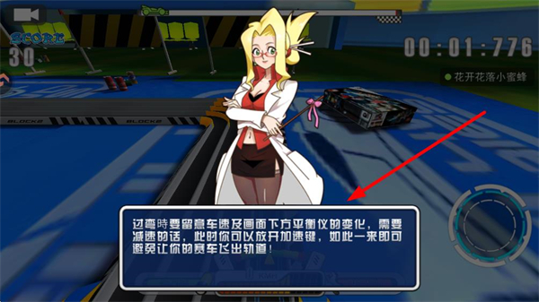 3、进入比赛后,注意游戏中的提示,过弯时要留意车速及画面下方平衡仪的变化,需要减速就放开加速键,避免赛车飞出赛道。