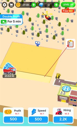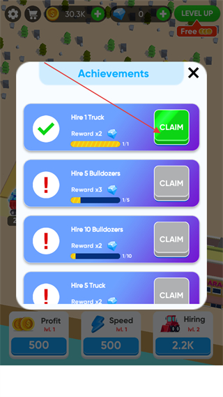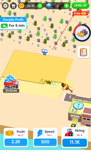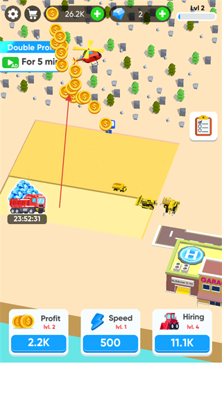 3、利用获得的金币,点击下方Hiring按钮,雇佣更多推土机等设备,提升挖掘效率。