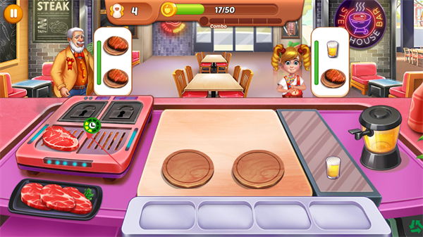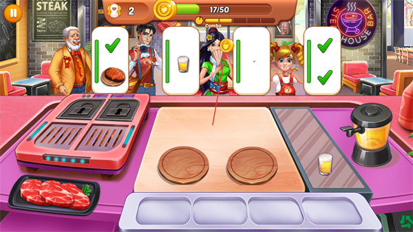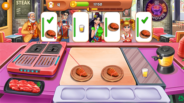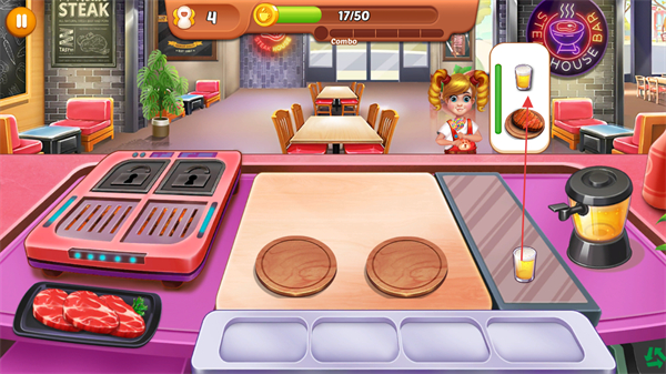 1、进入游戏,查看屏幕上方顾客需求标识,如牛排和饮品样式,同时留意关卡进度条17/50。