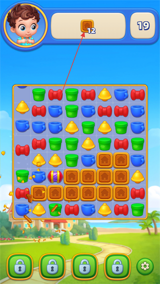 1、进入游戏关卡,查看上方目标数值如12,明确消除任务。