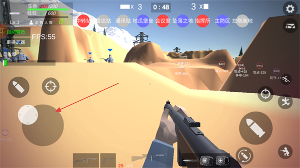 2、点击左下方移动按钮操控角色,在沙漠场景中移动寻找敌人。