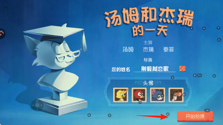1、标题汤姆和杰瑞的一天,主演汤姆、杰瑞、泰菲,有姓名刚毅超恋歌,头像选择及开始拍摄按钮。