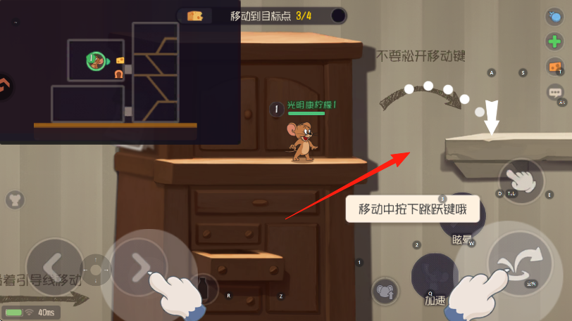 3、角色光明庚柠檬,任务移动到目标点3/4,操作提示移动中按下跳跃键哦,还有加速等技能按钮。