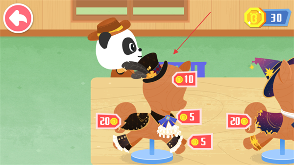 1、进入游戏界面,查看右上角金币数量如30,点击带有价格标签如10的小马服饰进行购买。
