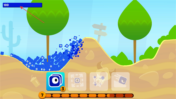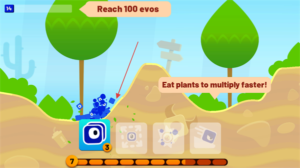 1、进入游戏,看到上方提示Reach100evos,点击屏幕下方技能图标发射蓝色方块。
