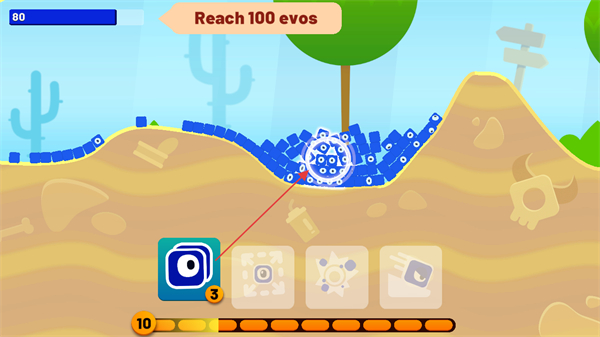 1、游戏开始,明确目标是Reach100evos,点击屏幕下方技能图标,发射蓝色方块。
