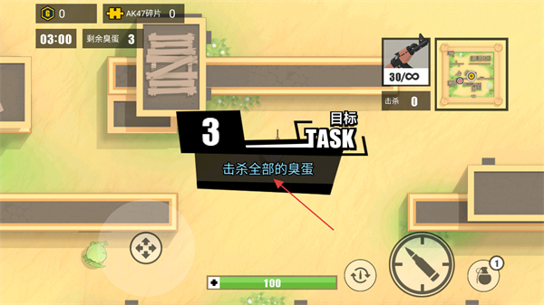 1、进入游戏,查看屏幕上方信息,明确剩余时间如03:00、剩余臭蛋数量,知晓目标是击杀全部的臭蛋。