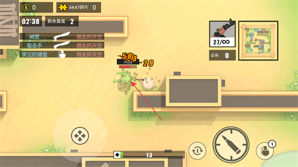 2、利用屏幕左侧的虚拟摇杆控制角色移动,右侧按钮控制射击等操作,找到并攻击臭蛋。