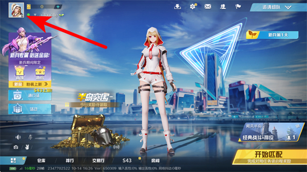 1、在荒野行动游戏的主界面,需要点击左上角头像,进入个人页面。